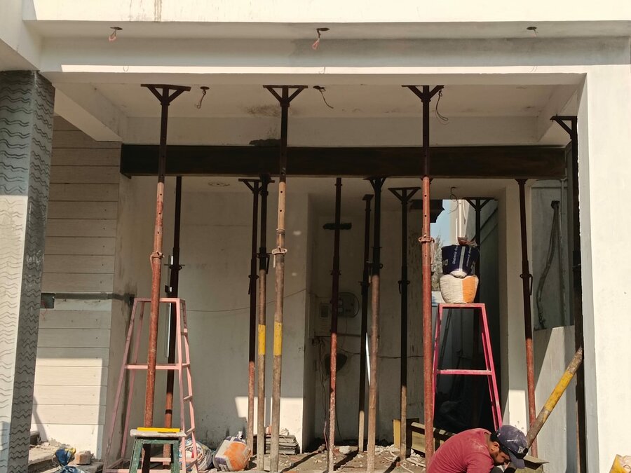 This project involves the use of adjustable metal props to temporarily support a horizontal beam during structural modifications or formwork setup. The image shows an array of props arranged beneath a concrete or precast beam segment, indicating a stage of slab casting or renovation. Scattered tools and materials confirm an ongoing civil construction process.