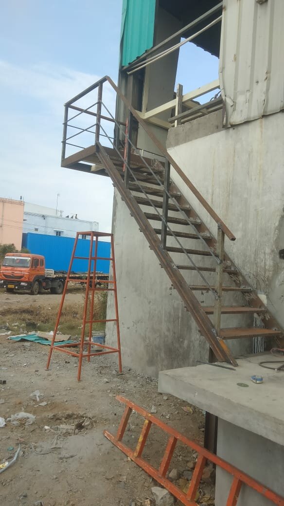 This project entails the fabrication and installation of an external metal staircase affixed to a concrete building. The staircase includes handrails on both sides and connects to an upper level enclosed with a green metal sheet wall. The construction site is active, with visible ladders and scattered materials, indicating ongoing structural enhancements or retrofitting for accessibility or fire safety.