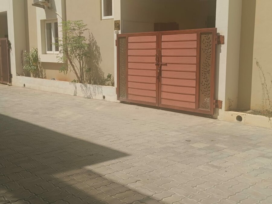 This project involves the design and installation of a custom wooden gate for a residential property. The gate features horizontal wood paneling with decorative metal accents and is framed by paved surroundings and greenery, enhancing both security and curb appeal.