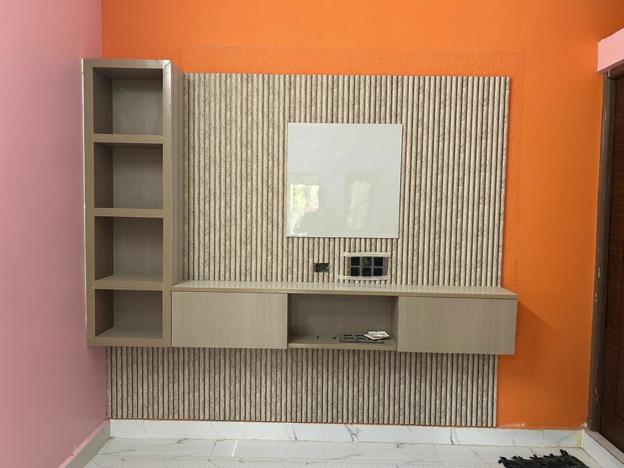 For our client Ms. Gomathi, we carried out the complete interior work of her residence within a span of 25 days. The project included the design and execution of a TV unit, Pooja unit, kitchen cupboards, and other essential fittings, all delivered with material supply. Our team ensured neat workmanship, timely delivery, and a finish that aligned with the client’s expectations, resulting in a functional and elegant home interior.