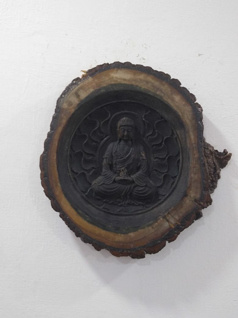 Hand-carved decorative wooden bowl with intricate relief patterns. Features traditional motifs and smooth finish.