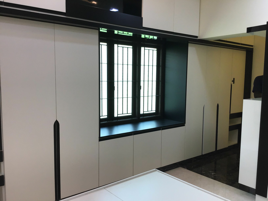 Impressive double-height wardrobe maximizing vertical space with ladder access to upper sections.
