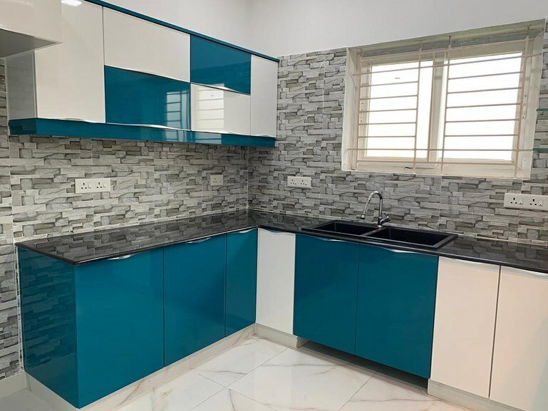 Project Specifications: Size: 8x10 ft, Cabinet: Marine plywood with laminate finish, Countertop: Quartz stone, Appliances: Built-in hob, chimney, microwave, Hardware: Soft-close hinges and slides
