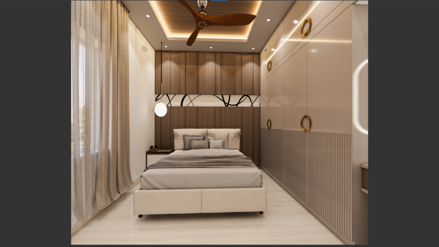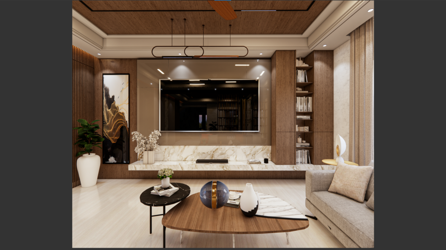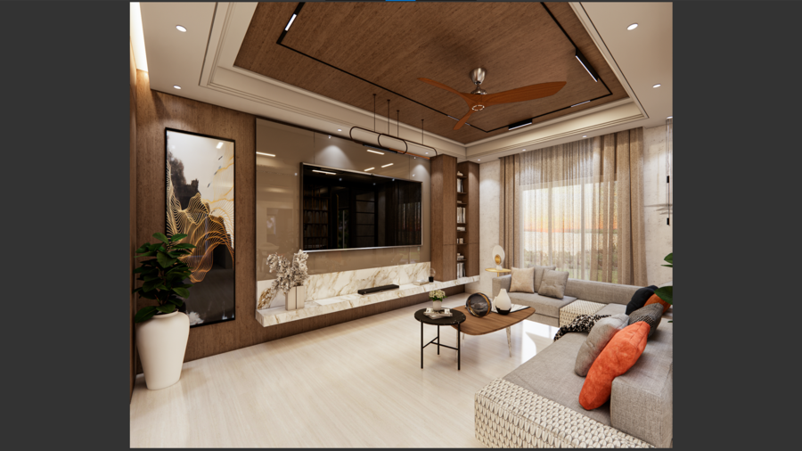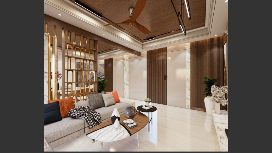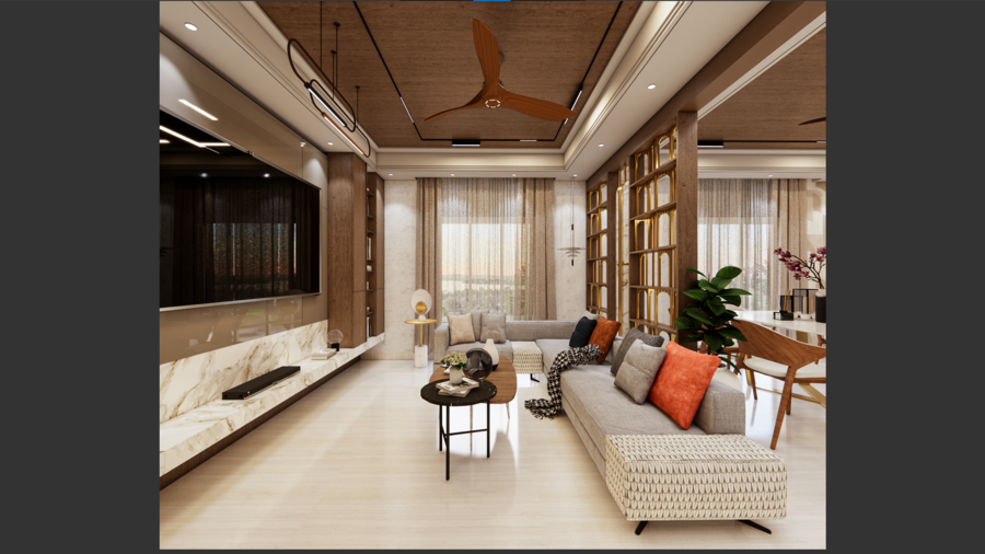 Project Specifications: Italian marble flooring, modular sofa set, ambient LED lighting, decorative wall panels