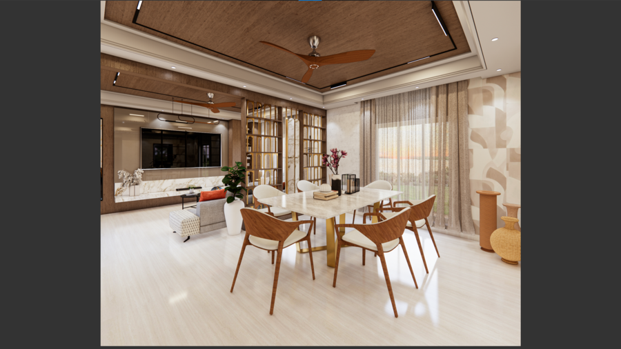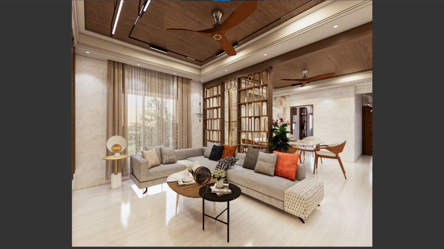 Spacious ground floor living room with modern aesthetics, premium lighting, and functional furniture arrangement