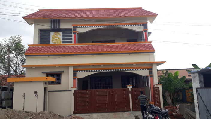 This residential project in Annur, Coimbatore spans 6500 sqft and features a three-story structure with a red-tiled roof and cream-colored walls. The design blends modern and traditional elements, including decorative orange and black accents, a large wooden entrance gate, and spacious balconies. Surrounded by greenery and built for multi-family living, the building emphasizes both aesthetic appeal and functional layout.