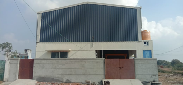 This warehouse facility in Somangalam, Chennai spans 2100 sqft and is designed for industrial storage and logistics operations. The structure features a corrugated metal roof and upper walls, a solid concrete base, and a large front-facing metal gate for vehicle access. A water tank is installed on the side, and the surrounding area shows signs of ongoing development, making it ideal for scalable industrial use.