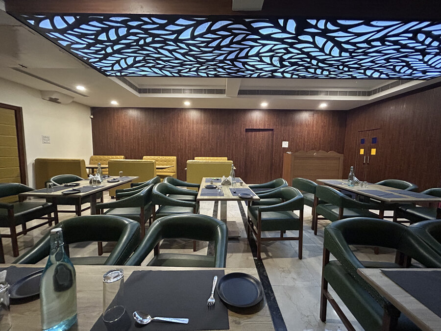 Project Specifications: Dining area interior with 3D design and execution for Hotel Royal Choza, completed in 30 days.