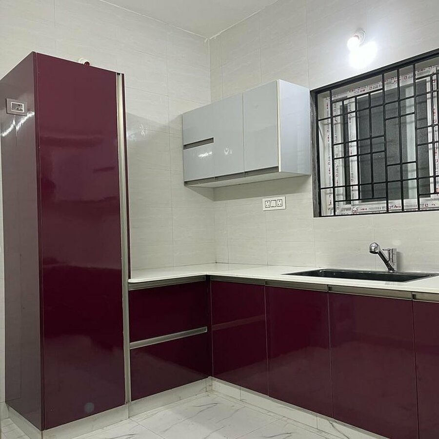 Project Specifications: Size: 8x14 ft, Cabinet: Teak wood with traditional carving, Countertop: Brown granite, Sink: Copper, Fittings: Brass